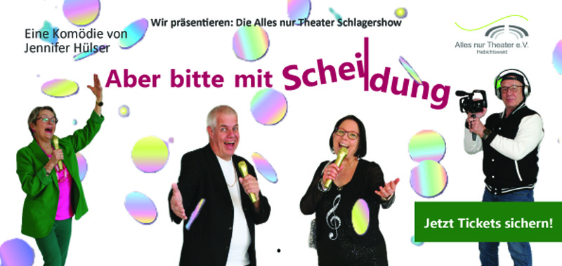 Und jede Woche bekommt Ihr an dieser Stelle eine neue Info zum kommenden Stück "Aber bitte mit Scheidung" von Jennifer Hülser. Alles dreht sich um das Schlagerduo "Penny und Jo", die in dieser Komödie ihr 30. Bühnenjubiläum feiern. Ein Tag, der mit Sicherheit anders verläuft, als die beiden sich das vorstellen konnten. In jedem Fall ein MordsSpaß.
