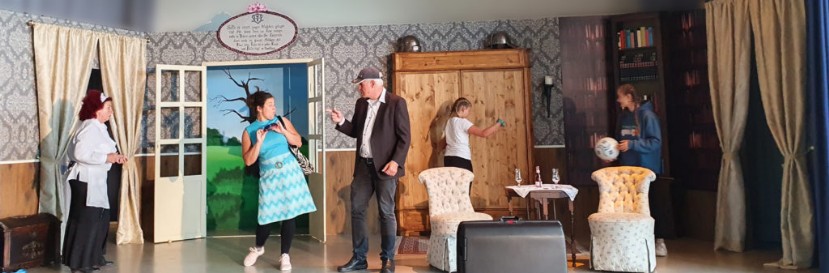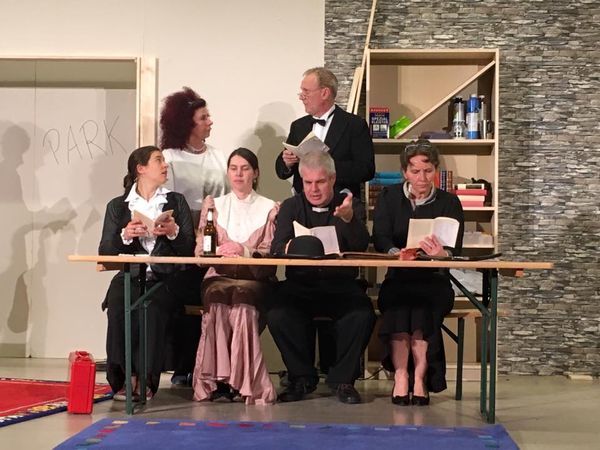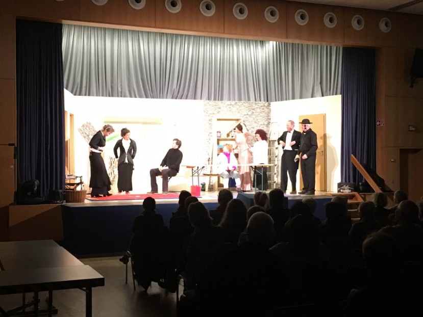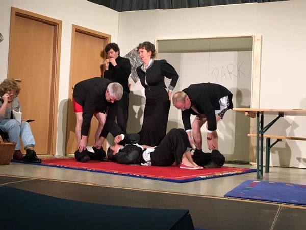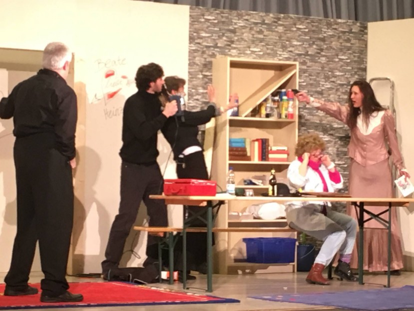 Die Verwechslungskomödie, bei der AnT eine Theatergruppe spielt, die endlich mal ein Stück mit Niveau aufführen möchte, traf voll und ganz den Geschmack des begeisterten Publikums. So verfolgten die Zuschauer die ambitionierten Proben zu „Pater Brown“ mit dem eigens dafür aus dem Internet engagierten Regisseur. Doch so einfach war das nicht: Wie im richtigen Theaterleben, musste der Verein während der Proben mit einigen Schwierigkeiten kämpfen. So sorgten der überforderte Regisseur, verpasste Einsätze, ein „Arbeitsunfall“ auf der Bühne, Texte wie Zungenbrecher, eine schlecht sehende Souffleuse, ein entflohener Bankräuber oder schlicht die nicht sitzenden Kostüme für Aufregung und für manche Lachträne. Sehenswert waren auch die liebevoll skizzierten Charaktere. Doch zum Schluss wurde klar: Nicht nur der Mörder im Stück von Pater Brown wurde überführt, sondern auch der Bankräuber im richtigen Leben wurde enttarnt.