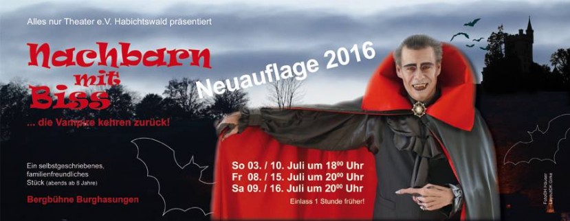 Gerade hat AnT das Indoorstück „Dieses Mal etwas mit Niveau!“ sehr erfolgreich in der Mehrzweckhalle Dörnberg aufgeführt – und schon tummelt sich die muntere Truppe wieder auf der Bergbühne Burghasungen! Denn hier sind demnächst wieder die Dorfbewohner von Hinterburghas mit den Vampiren unterwegs! An einem herrlich schönen Frühlingsabend trafen sich die Akteure von „Nachbarn mit Biss“ auf der Bühne, um zu schauen, ob die Rollen vom Vorjahr noch sitzen – und die saßen, und wie! Mit viel Spaß und Spielwitz gelang der erste Durchlauf des Stückes schon wieder sehr gut. Das Ensemble freute sich, wieder gemeinsam auf der Bühne zu stehen und so erwachte die Bergbühne zu erstem Leben.