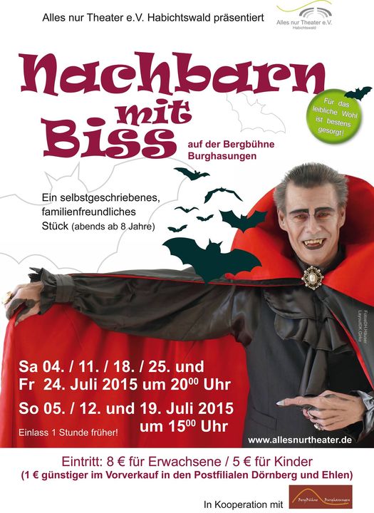 Der Sommer 2015 war ziemlich verregnet, einige Vorstellungen unseres Stückes "Nachbarn mit Biss" mussten leider ausfallen. Deshalb eine Wiederholung dieses großartigen Stückes im Sommer 2016. (Bilder und Videos dazu siehe weiter unten, Sommer 2015)