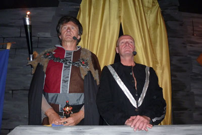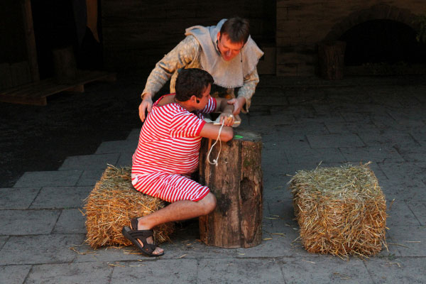 Auf der BergBühne Burghasungen kann man sich von mittelalterlichem Flair und von derin Nordhessen wohl einmaligen „3- Ebenen-Aufführung“ verzaubern lassen. Das Stück überrascht immer wieder, weil die Handlung auf verschiedenen Ebenen gespielt wird. Berichtet der Hofnarr gerade noch auf der Hauptbühne vom finsteren Mittelalter, so sieht man direkt hinter sich, auf der mittleren Ebene, ein Lager der vertriebenen Bauern. Dann, ganz oben, direkt am Waldrand, heckt die böse Hexe finsterte Pläne aus…, sofort danach ertönt das vorlaute Mundwerk des Skeletts wieder auf der unteren Bühne. Während am Bachlauf heftig gekämpft wird, sind die Bösewichte Sheriff von Nottingham und Sir Guy von Gisborne nicht untätig und machen es Robin Hood und seinem Gefolge schwer, der holden Marian beizustehen. Doch auch das Lustige kommt nicht zu kurz… dafür sorgt unter anderem Bruder Tuck mit seiner (auch für kleine Kinder geeignete) „Striptease-Einlage“, die allen bestimmt im Gedächtnis bleiben wird.