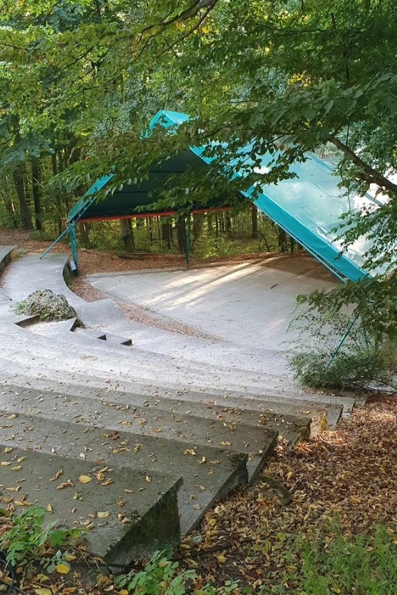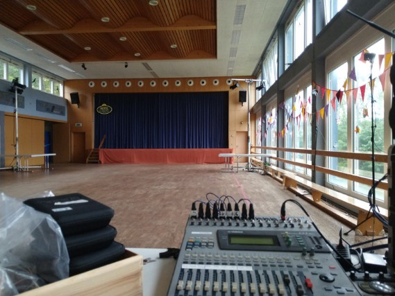 "Unsere" Indoor-Bühne ist die Mehrzweckhalle in Dörnberg. Der Vorteil hier besteht darin, dass wir absolut wetterunabhängig spielen können, wenn auch nicht in der gleichen traumhaften Atmosphäre wie zwischen den Felsen im Wald. (Aber dafür muss sich auch niemand mit einer DiXi Toilette begnügen.)
